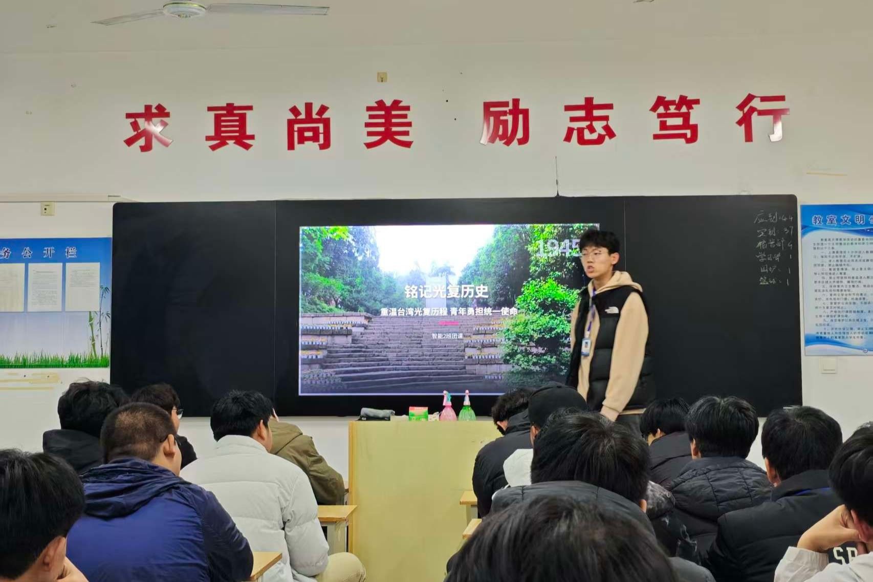 为引导青年团员铭记台湾光复历史,凝聚维护国家统一的青春共识,11月6日晚,汽车工程学院组织各班开展“重温台湾光复历程,青年勇担统一使命”主题团课,在历史回望中坚定理想信念,在使命传承中激发奋进力量。团课伊始,团支书以时间为轴,紧扣“历史溯源—法理解读—现实担当”主线,系统梳理了台湾光复的壮阔历程。活动中,通过组织观看纪录片《台湾光复档案》片段,同学们直观感受了台湾同胞50年反抗殖民统治的英勇斗争,深刻认识到“...更多 -