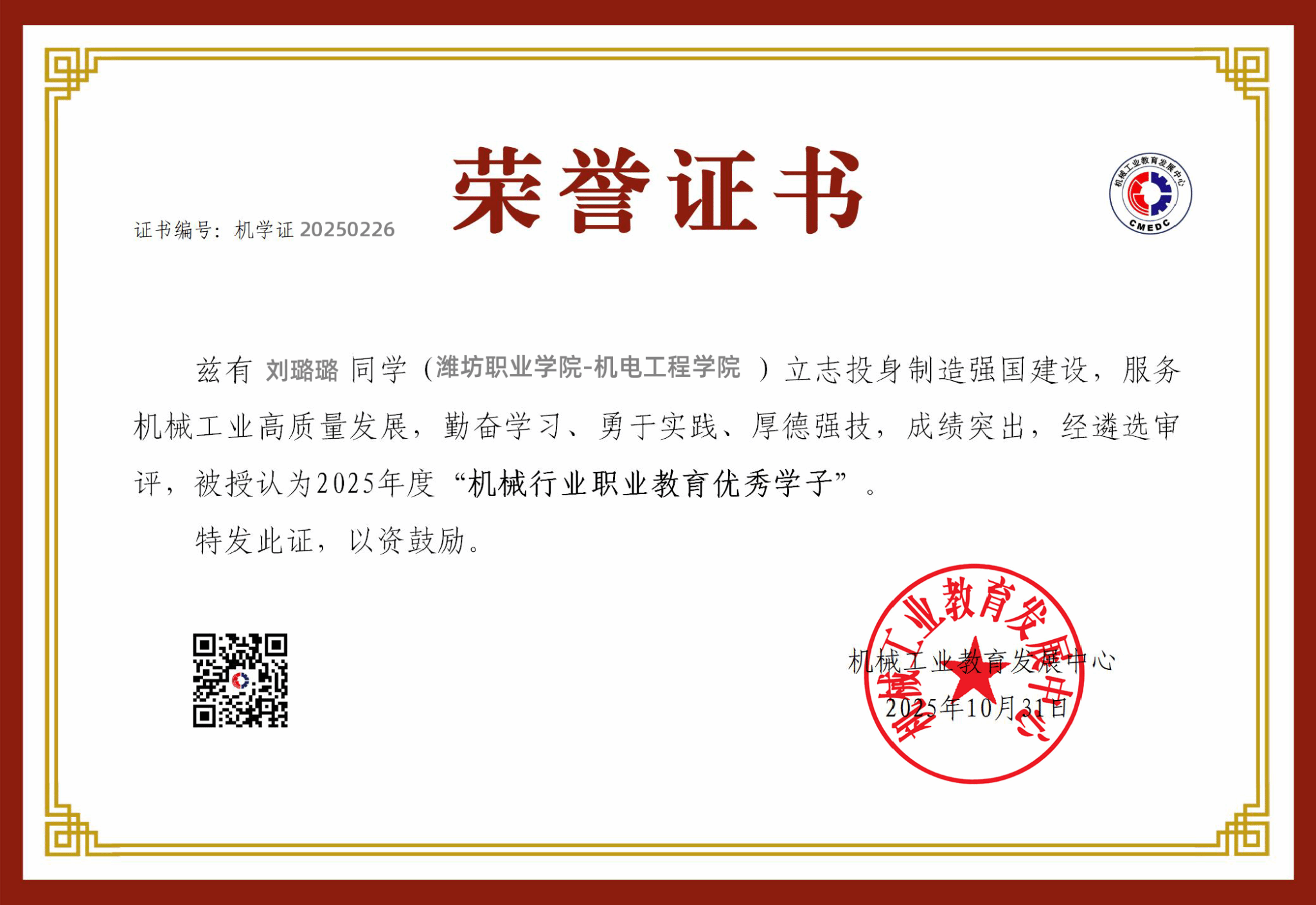 近日,首届“机械行业职业院校优秀学子”遴选认定工作结果正式揭晓。经院校推荐、专家评审及公示程序,全国共496名2025届毕业生获此殊荣。我院机电工程学院刘璐璐、崔晓阳,汽车工程学院高峰、潘洪俊四位同学凭借优异的综合素质和突出的专业技能成功入选。
