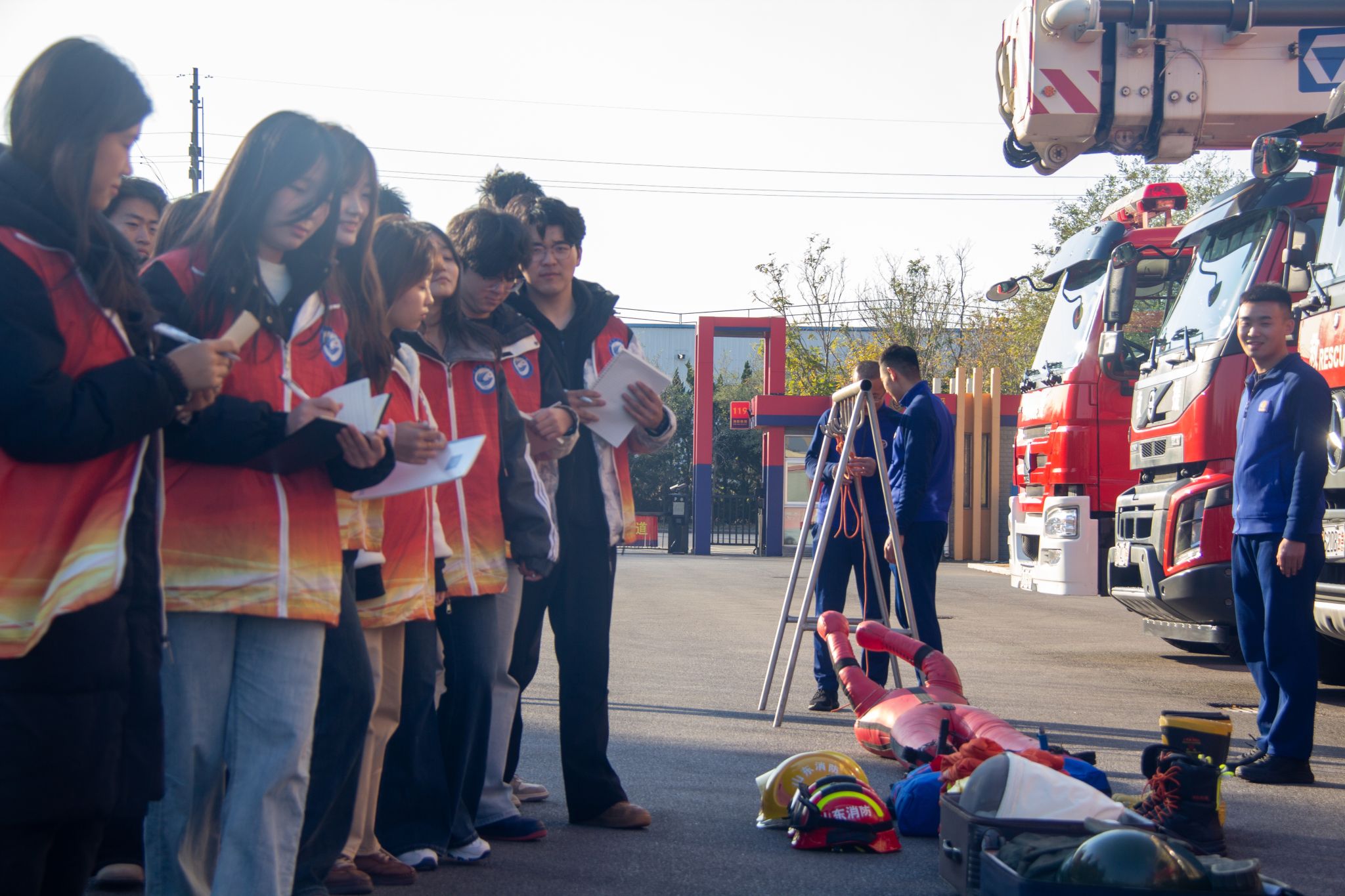 活动中,消防员带领志愿者走进消防装备库房,详细介绍了水带、空气呼吸器、破拆工具等各类消防装备的实际用途与操作要领,并现场演示了灭火器“一提二拔三握四喷”的正确使用方法。随后,活动移至训练场,在消防员的专业指导下,志愿者们轮流穿戴厚重的消防服,完成水带连接等实战科目,切身体会到消防员在火场中分秒必争的紧迫感与其所承载的责任重量。整个过程中,消防员动作迅速、操作规范、讲解细致,同学们态度认真、响应积极,学习氛围浓厚。活动最后,全体志愿者与消防员合影留念,用镜头记录下这段难忘的实践经历。