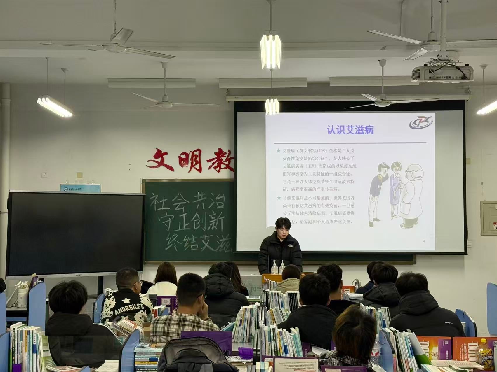 团课采用“PPT系统讲解+纪实短视频展播+互动答疑”的多元形式,让科学防艾理念入脑入心。活动伊始,一段记录艾滋病患者真实生活的短片打破了认知隔阂,让同学们深刻意识到,防艾不仅是公共卫生命题,更是关乎生命尊严的社会课题。知识讲解环节中,团支书从艾滋病核心定义切入,明确其由人类免疫缺陷病毒(HIV)引起的疾病本质,系统梳理了性接触、血液、母婴三大传播途径的具体场景。针对校园中常见认知误区,以“日常握手拥抱不传染、蚊虫叮咬不传播”等清晰结论逐一澄清,传递“科学认知是最好防护”的理念。围绕同学们关注的健康防护问题,活动重点强调“早检测、早诊断、早治疗”的重要性,详细介绍感染后各阶段特征,并传递关键科学结论。