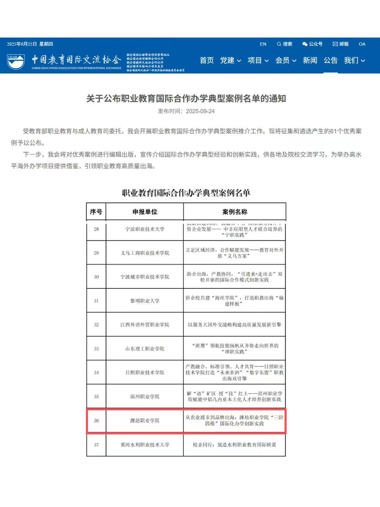 9月24日,由教育部职业教育与成人教育司组织的职业教育国际合作办学典型案例遴选结果公布,全国共有61个案例入选。我院报送的《从农业援非到品牌出海:“三阶四维”国际化办学创新实践》成功入选,成为职业教育国际合作领域的典型代表。