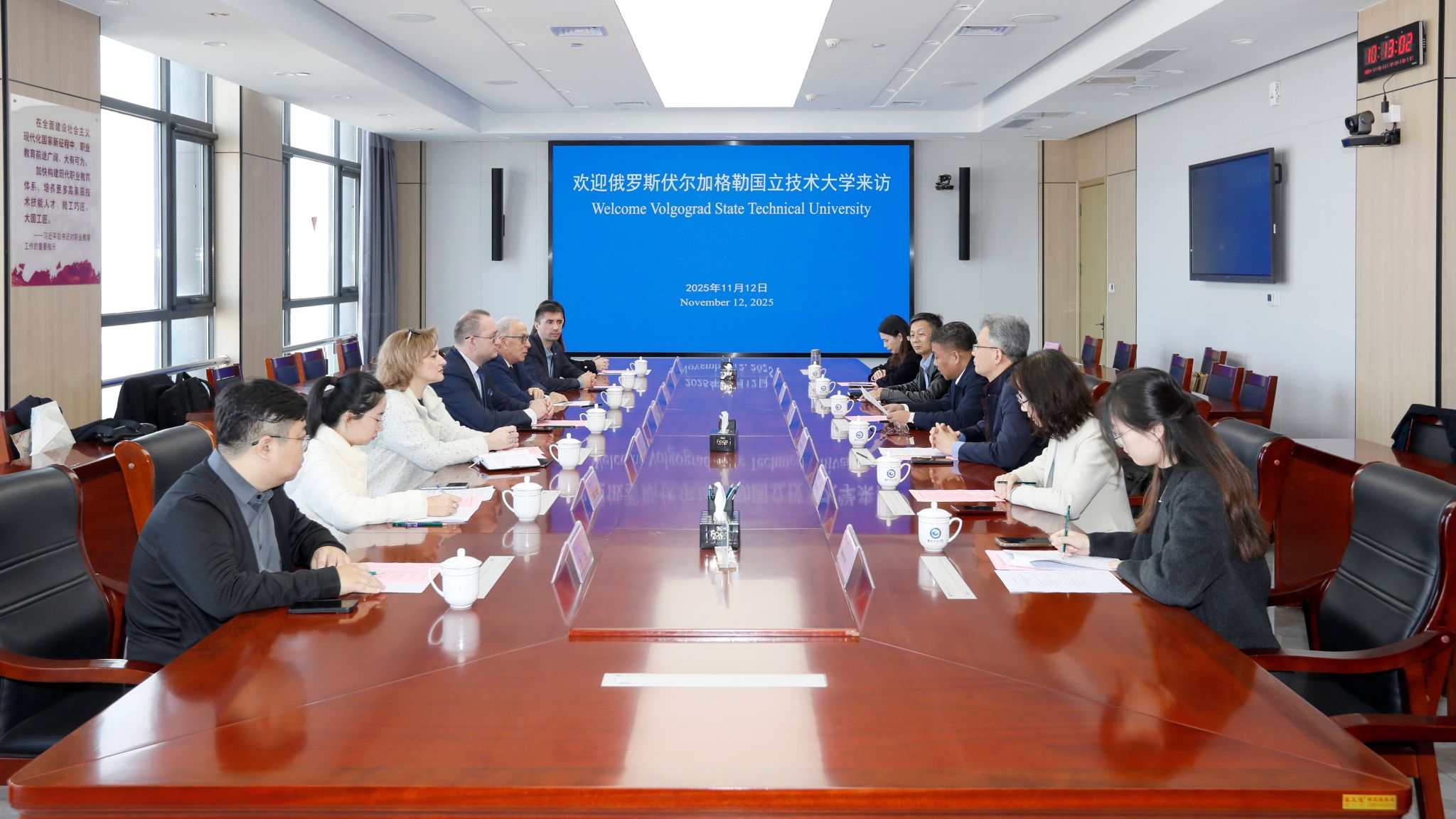 韩瑞东对代表团的到访表示热烈欢迎,充分肯定了中俄合作办学项目当前的良好发展态势,希望双方继续携手,聚焦学生培养方案的优化与落实,共同将合作项目打造成为引领专业发展、培育高素质技术技能人才的高质量发展平台。博约科对我院的热情接待表示感谢,简要介绍了伏尔加格勒国立技术大学的办学基本情况、当前取得的办学成果,特别表达了对合作项目的高度重视与持续投入的决心。