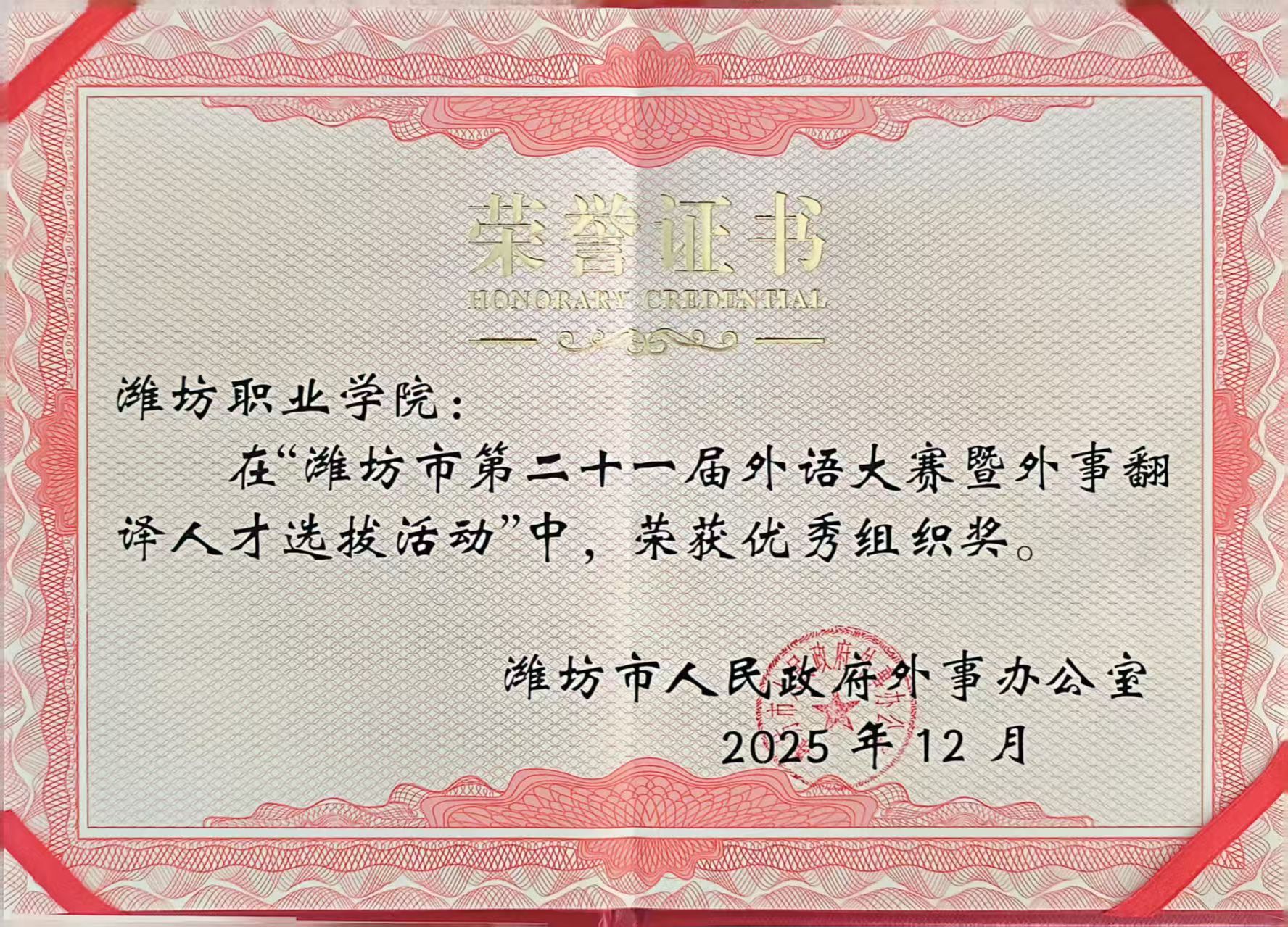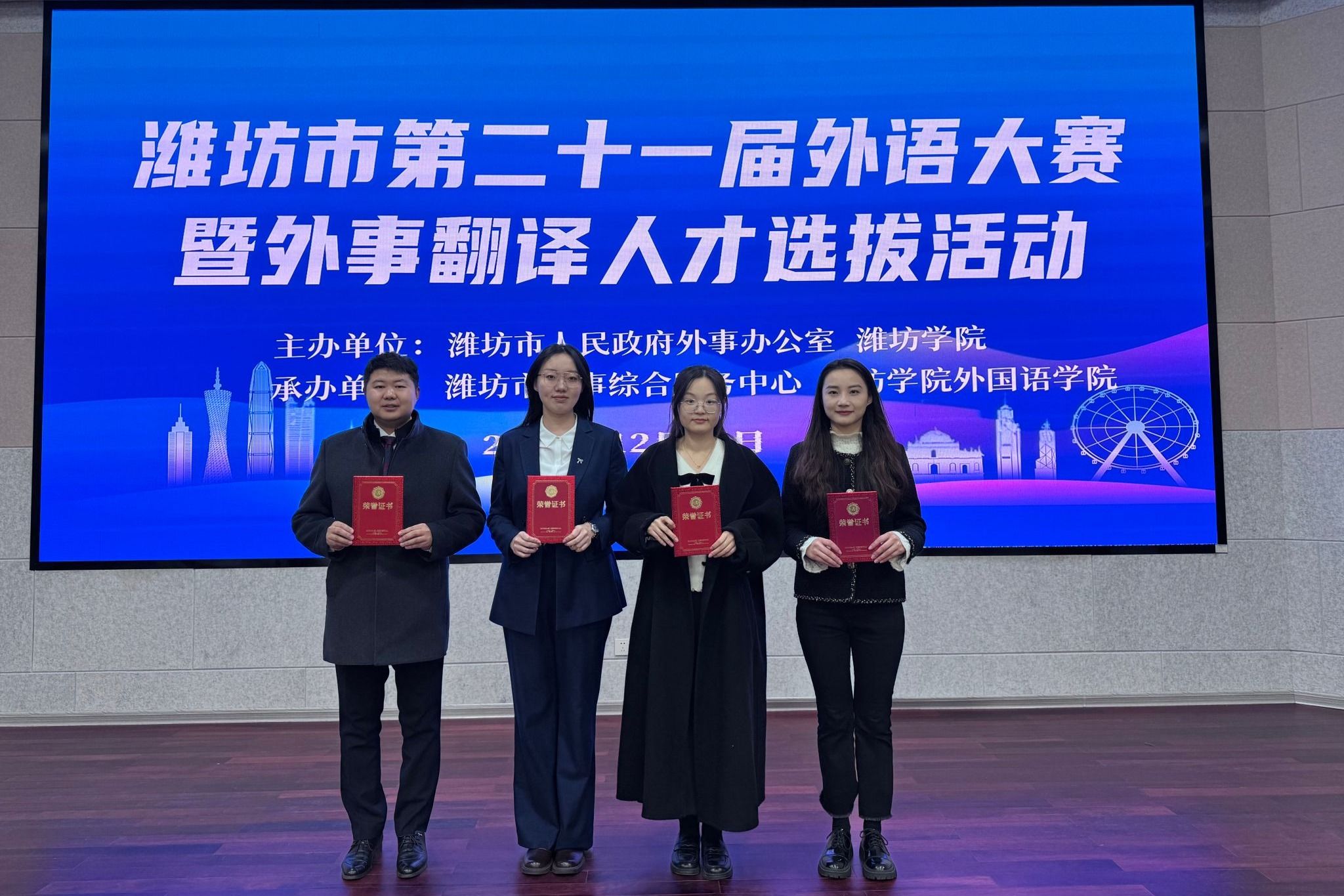 近日,潍坊市第二十一届外语大赛暨潍坊市外事翻译人才选拔活动顺利举行。我院教师在比赛中表现优异,荣获二等奖1项、三等奖2项、优胜奖1项。我院荣获优秀组织奖。