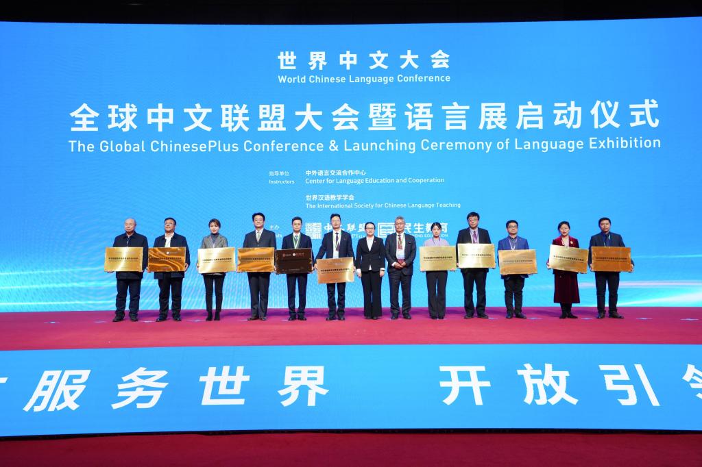 12月7日至9日,由教育部主办的“2023年世界中文大会”在北京国家会议中心举行,来自全球160多个国家和地区的的教育主管部门、院校及教育机构代表、国际中文教育领域内的知名专家、学者参与活动。学院在12月8日下午举行的“全球中文联盟大会暨语言展启动仪式”上,“中文联盟数字化教育金牌合作机构”“中文联盟数字化教育金牌教师”名单揭晓,我院获评“中文联盟数字化教育金牌合作机构”,我院国际教育学院汉语教师刘阳获评“中文联盟数字化教育金牌教师”。学院党委副书记韩瑞东,学院领导李瑞昌及国际教育学院相关负责同志参加颁奖仪式,学院党委副书记韩瑞东同志代表学院上台领奖。