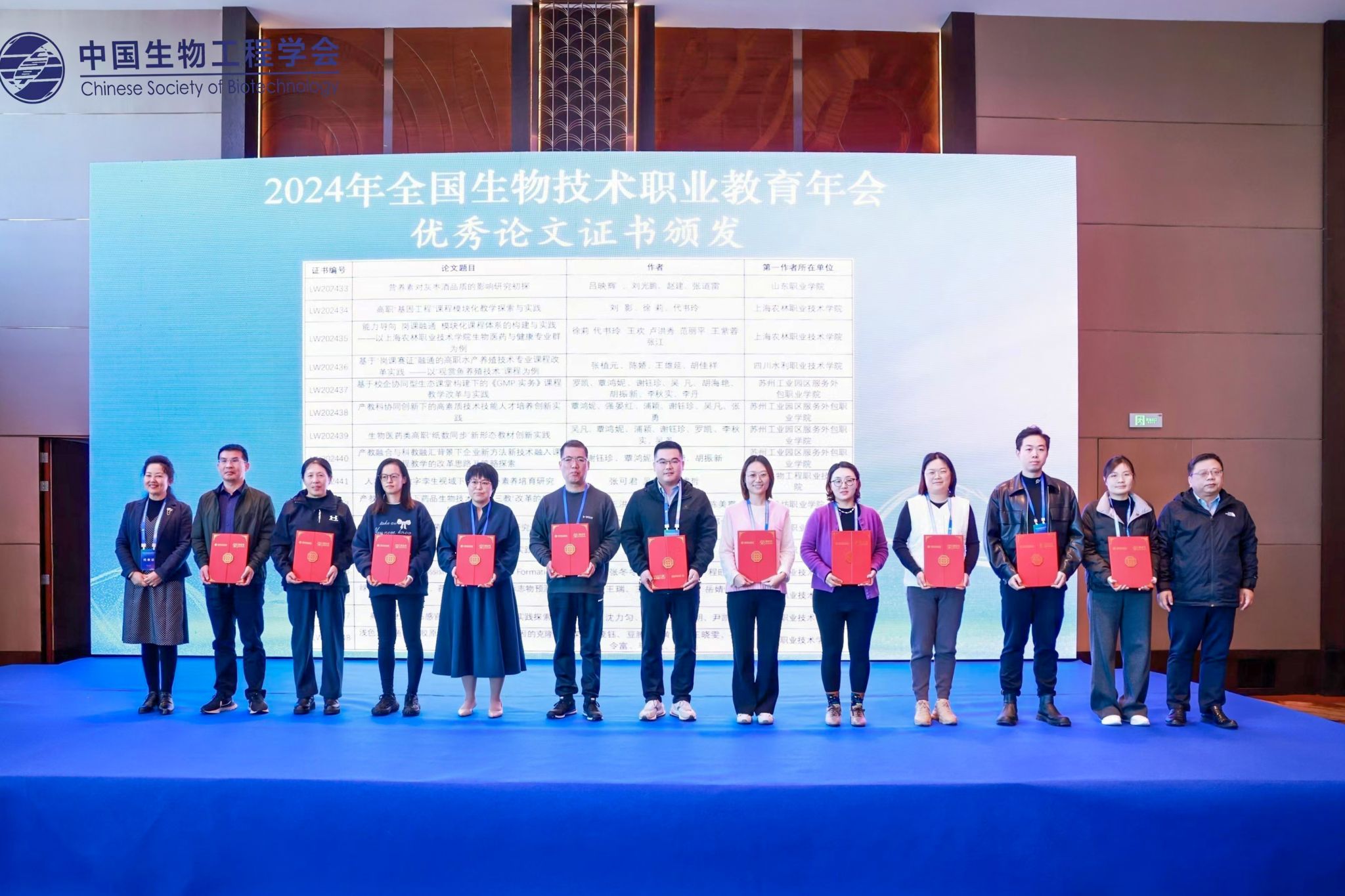 在随后召开的全国生物技术职业教育年会上,食品药品学院贾海健老师以《产教融合背景下药品生物技术专业“三教”改革的探索与实践》为题作典型发言,受到与会全国职业院校生物技术领域专家同行一致好评。会上还为2023年结题教改项目、2024年立项教改项目和年会优秀论文颁发证书,学院共有8个项目入选。
