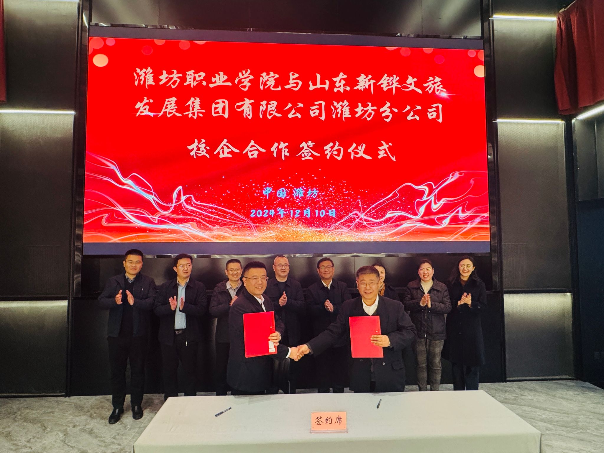 山东新铧文旅发展集团有限公司潍坊分公司与我院代表共同签署了校企合作协议,韩瑞东和新华书店潍坊分公司及新铧文旅集团潍坊分公司领导同志出席了签约仪式。双方希望以此次活动为合作契机,寻找更多的融合点和创新点,为促进学生实习和就业、共建人才培养新高地、共谋人才培养新路径创造新的机遇。