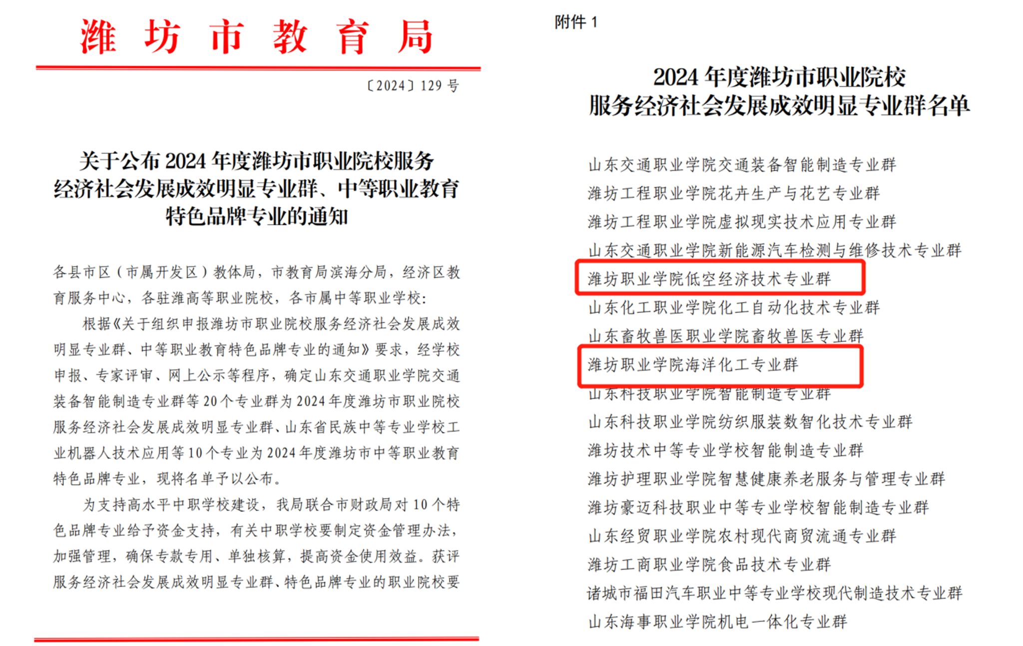 12月6日,潍坊市教育局行文公布了2024年度潍坊市职业院校服务经济社会发展成效明显专业群名单,我院低空经济技术和海洋化工2个专业群入选。