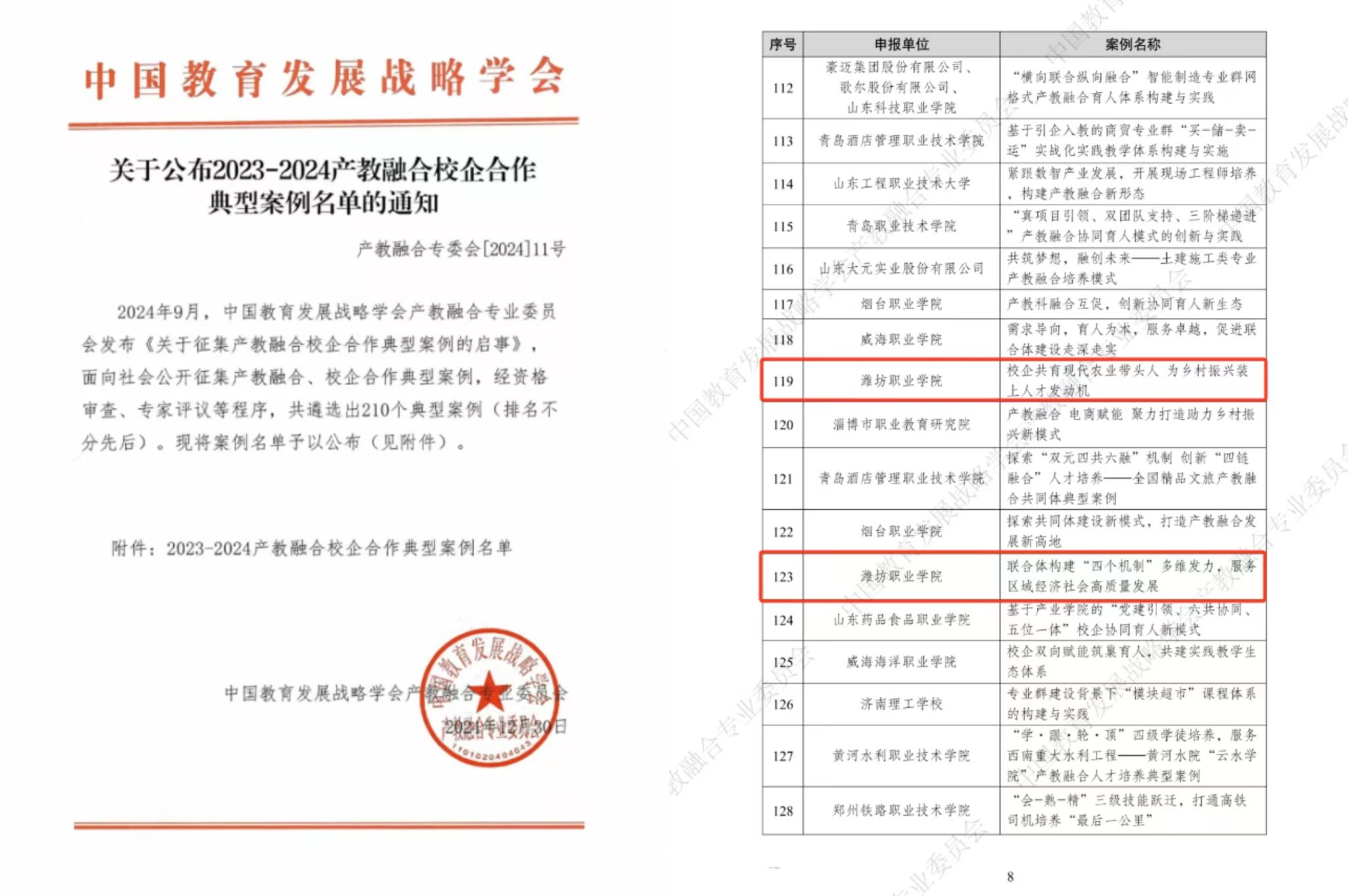 近日,中国教育发展战略学会产教融合专委会发布2023-2024年度产教融合校企合作典型案例名单,我院牵头建设的滨海经济技术开发区市域产教联合体典型案例《联合体构建“四个机制”多维发力,服务区域经济社会高质量发展》、山东省现代高效农业产教融合共同体典型案例《校企共育现代农业带头人 为乡村振兴装上人才发动机》榜上有名。此次评选全国共有210项典型案例入选。