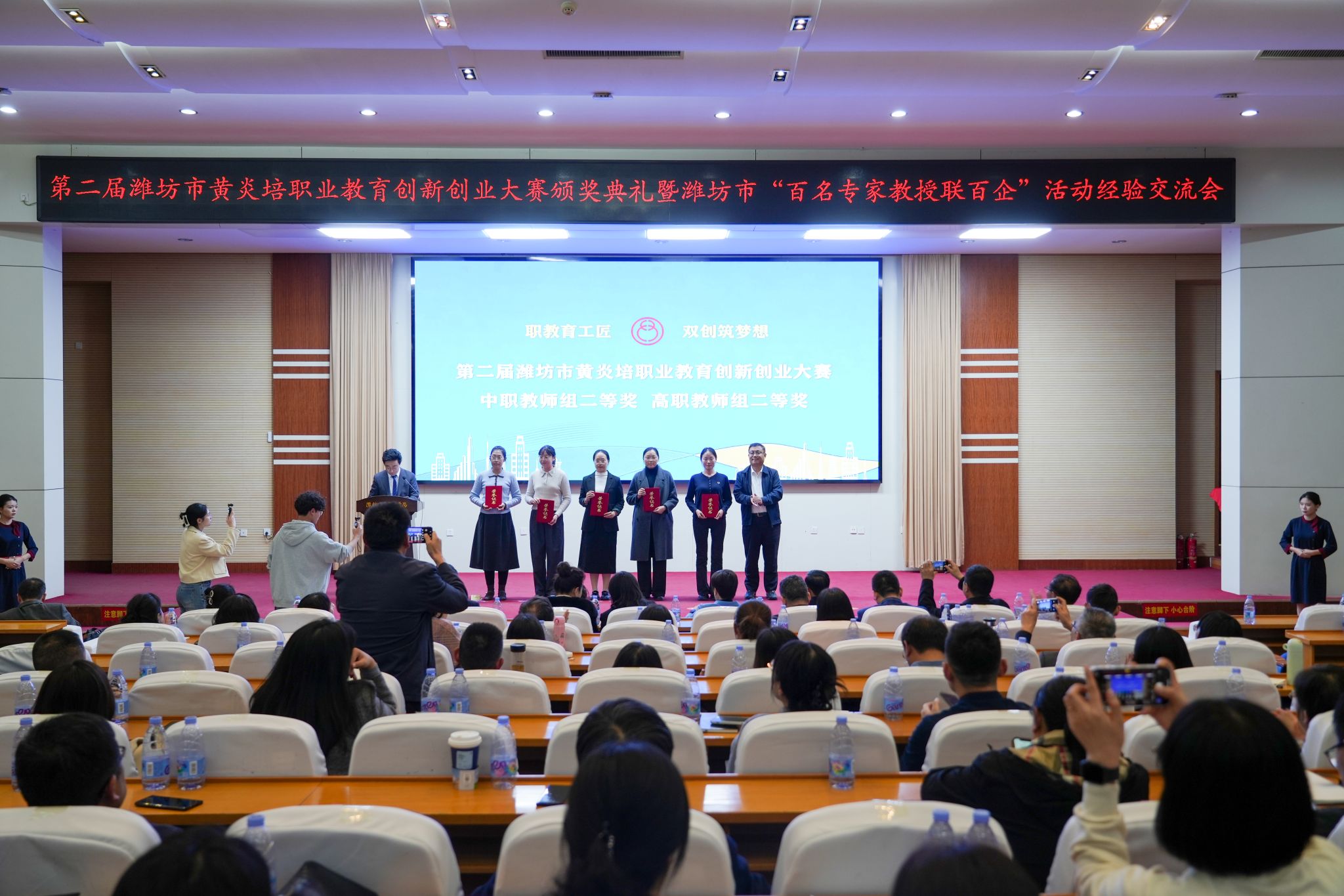 10月29日下午,第二届潍坊市黄炎培职业教育创新创业大赛颁奖典礼暨“校企同心 携手共进”——潍坊市“百名专家教授联百企”经验交流会在潍坊工程职业学院举行。学院院长韩瑞东出席会议并为获奖人员颁奖,科技处、招生就业处负责人及相关工作人员参加会议。
