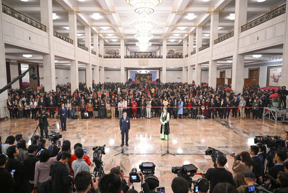 ??闭幕会前,人民大会堂中央大厅北侧,第三场“代表通道”集体采访活动正在进行。