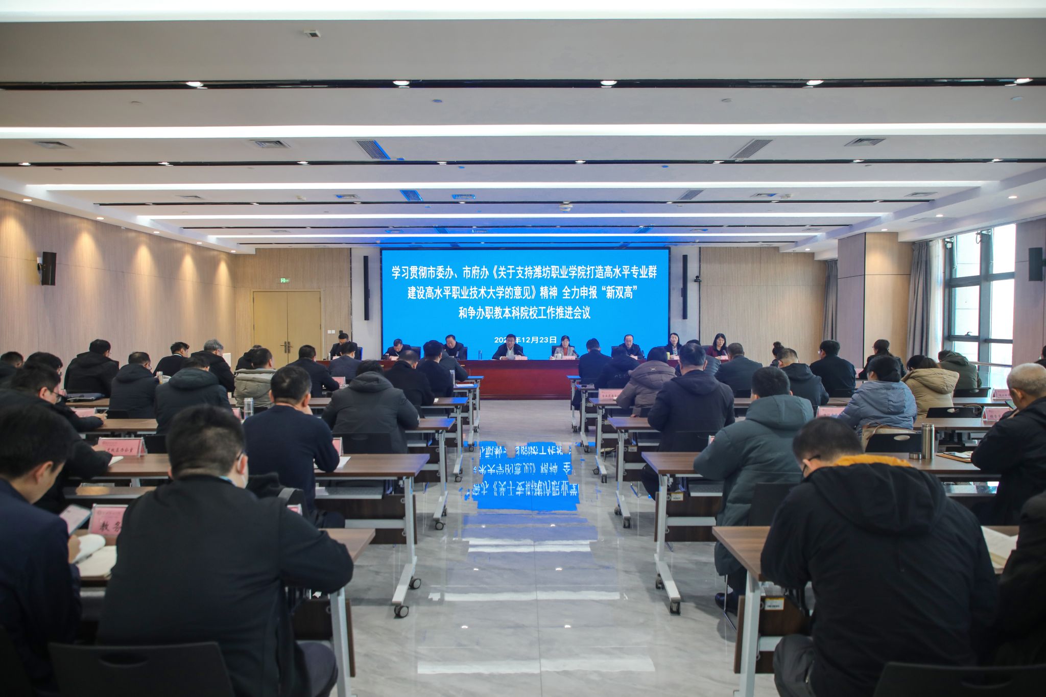 近日,市委、市政府以“两办”名义印发《关于支持球友会官方网站-球友会(中国)打造高水平专业集群建设高水平职业技术大学的意见》,就加强组织领导、统筹各有关部门(单位)项目、资源,全力支持学院高质量发展作出安排。为深入学习贯彻落实“两办”意见精神,学院于12月23日组织召开专门会议提出要求。学院党政领导班子成员出席会议,全体中层干部和学院“双高”建设办公室成员及相关专业骨干教师参加会议。