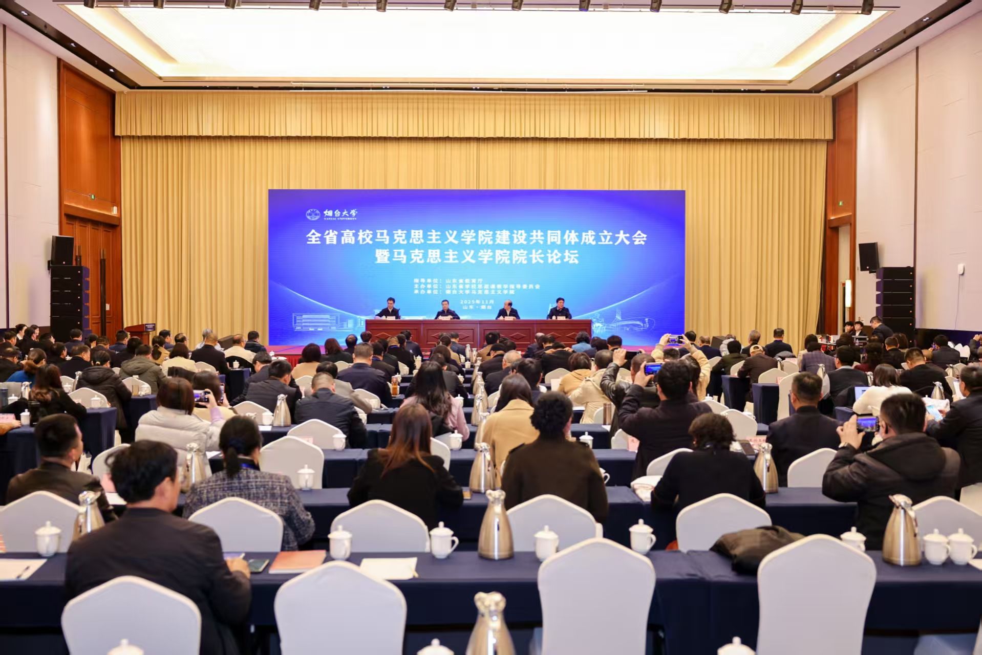 近日,全省高校马克思主义学院建设共同体成立大会暨马克思主义学院院长论坛在烟台召开,省教育厅总督学王志刚出席会议并讲话。学院党委委员、宣传部部长鞠桂芹及马克思主义学院主要负责同志参加会议。会上,我院当选共同体副理事长单位。