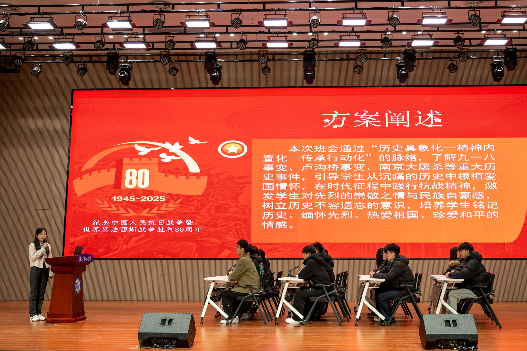本次班会采用现场展示的形式,每位选手进行2分钟方案阐述与8分钟情景再现。经二级学院初赛选拔,共有13名辅导员晋级决赛。参赛选手紧密围绕思想引领、价值观塑造、学风建设、心理健康、安全教育及生涯规划等方面,结合重要时间节点与学生实际需求,灵活运用PPT、短视频、案例剖析等多种形式,融入社会学、心理学、管理学等相关理论,针对“抗战精神与爱国主义教育”“理性上网与手机使用管理”“大学生心理健康维护”等特色主题展开精彩展示。展示形式新颖,紧扣教育规律与时代特点,聚焦学生成长中的现实问题,创新教育方法,充分展现了辅导员扎实的专业素养与突出的育人实效。