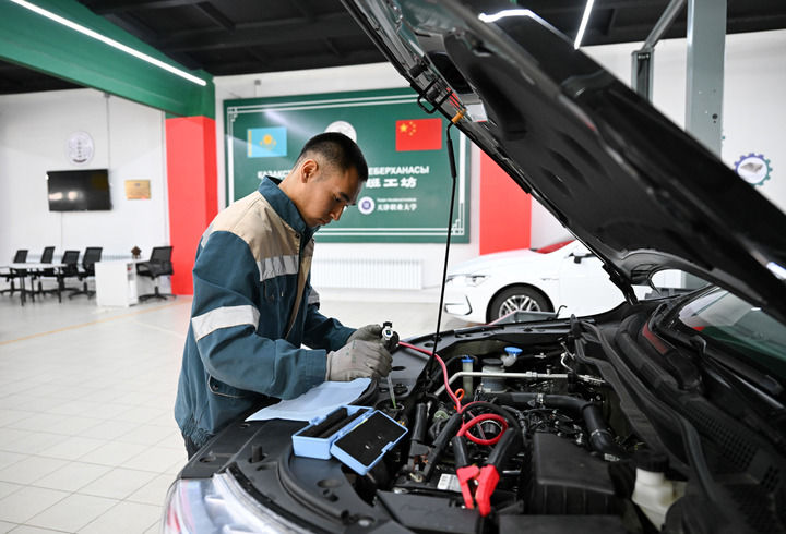 ??2025年5月9日,在哈萨克斯坦东哈萨克斯坦州首府厄斯克门的鲁班工坊,学员练习汽车检修技能。新华社记者 李任滋 摄