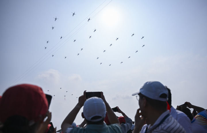 ??9月3日,习近平总书记同来自五大洲的外国友人并肩站立在天安门城楼上。26架直升机组成巨大的“80”字样飞过,众人仰首凝望。