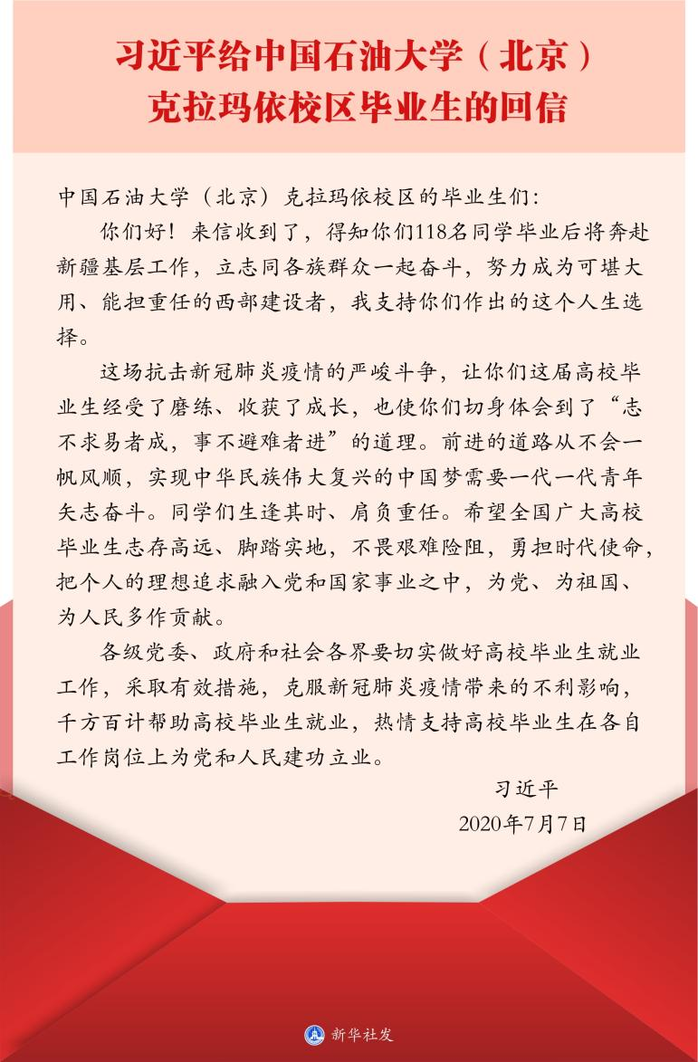 ??志不求易者成,事不避难者进。“得知你们118名同学毕业后将奔赴新疆基层工作,立志同各族群众一起奋斗,努力成为可堪大用、能担重任的西部建设者,我支持你们作出的这个人生选择。”2020年7月7日,总书记给中国石油大学(北京)克拉玛依校区毕业生回信,肯定他们到边疆基层工作的选择。