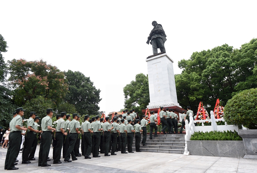 ??在位于重庆市铜梁区的邱少云烈士纪念馆,武警官兵向邱少云烈士纪念碑献花(2017年9月30日摄)。新华社记者 唐奕 摄
