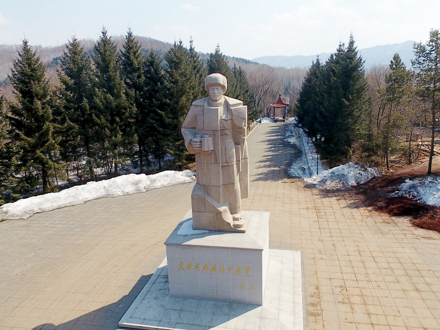 ??矗立在吉林省靖宇县杨靖宇将军殉国地的杨靖宇雕像(2017年3月22日摄)。新华社记者 曾涛 摄