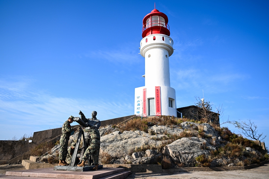 ??开山岛守岛民兵保养清洁王继才雕像(2024年10月25日摄)。新华社记者 邓华 摄